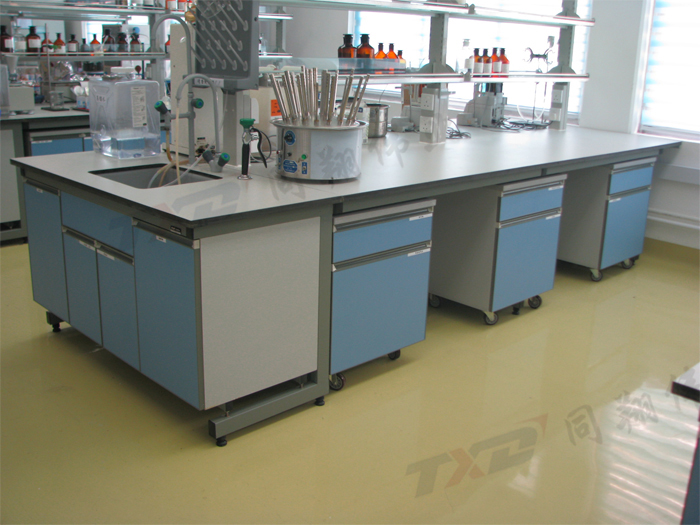 中央臺組成結構:由基柜、臺面板、試劑架等組成,臺面板可根據不同需求進行選擇,也可根據不同需求設計不同空人位,空位處內側有可拆裝活動擋板,以便維修電路和安裝;可任意推拉的活動基柜,減少了實驗室衛生死角,并具可隨時挑換操作者的位置,可定位在不同位置,風格獨特,款式新穎;水槽兩側活動門板,可內置自動開閉式垃圾桶,給實驗室環境清潔帶來方便,并最大程度節約了空間