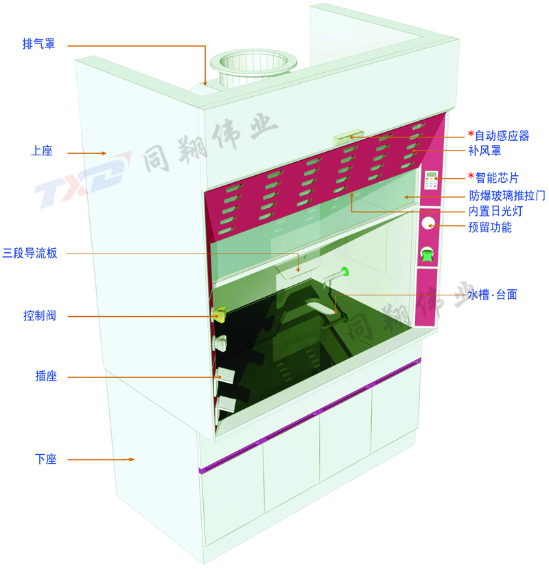 A.結構組合:采用三段組合式柜體,上部柜體(通風柜),中間(操作臺面),下部柜體(內含單側獨立抽氣式組成柜及另側獨立水、電、管線系統容納柜設計。